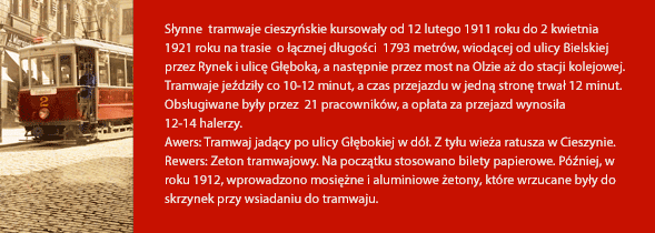 Awers: Tramwaj jadący po ulicy Głębokiej w dół. Z tyłu widać ratusz w Cieszynie. Rewers: Żeton tramwajowy. Na początku stosowano bilety papierowe. Później, w roku 1912, wprowadzono mosiężne i aluminiowe żetony, które wrzucane były do skrzynek przy wsiadaniu do tramwaju.