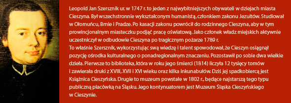 Leopold Jan Szersznik ur. w 1747 r. to jeden z najwybitniejszych obywateli w dziejach miasta Cieszyna. Był wszechstronnie wykształconym humanistą, członkiem zakonu Jezuitów. Studiował w Ołomuńcu, Brnie i Pradze. Po kasacji zakonu powrócił do rodzinnego Cieszyna, aby w tym prowincjonalnym miasteczku podjąć pracę oświatową. Jako członek władz miejskich aktywnie uczestniczył w odbudowie Cieszyna po tragicznym pożarze 1789 r.
